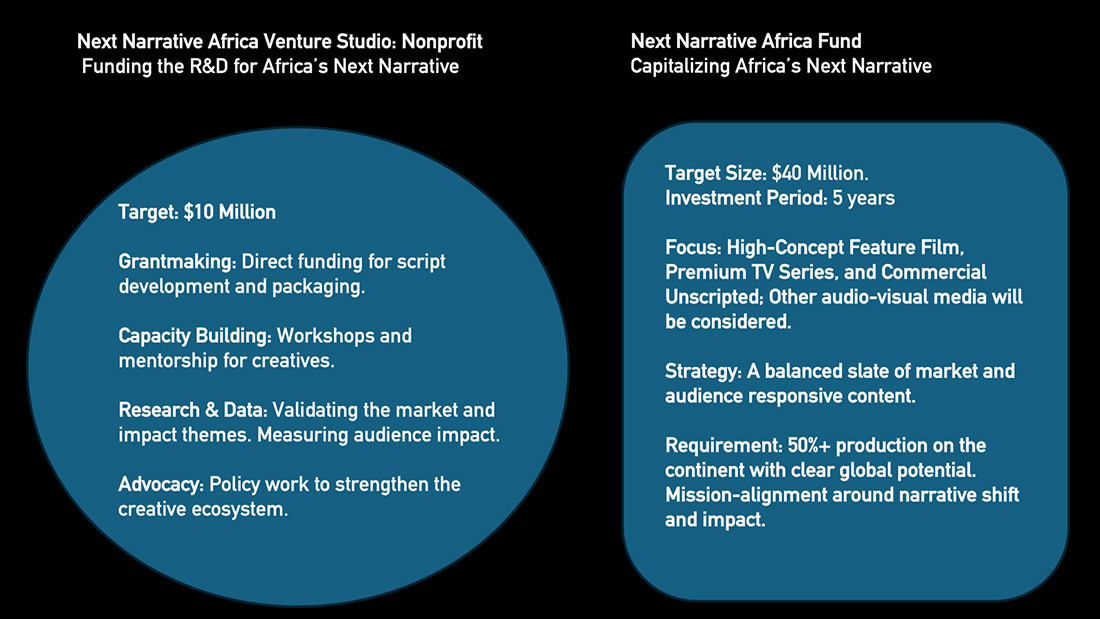 The Next Narrative Africa Fund is a mission-driven content and media investment vehicle targeting $50 million in total capitalization to support commercially viable audio-visual content made on the Continent by African and African-diaspora storytellers. With initial seed backing secured, NNAF is executing a hybrid strategy to deploy $40 million in commercial equity financing alongside a $10 million grant-making venture studio.